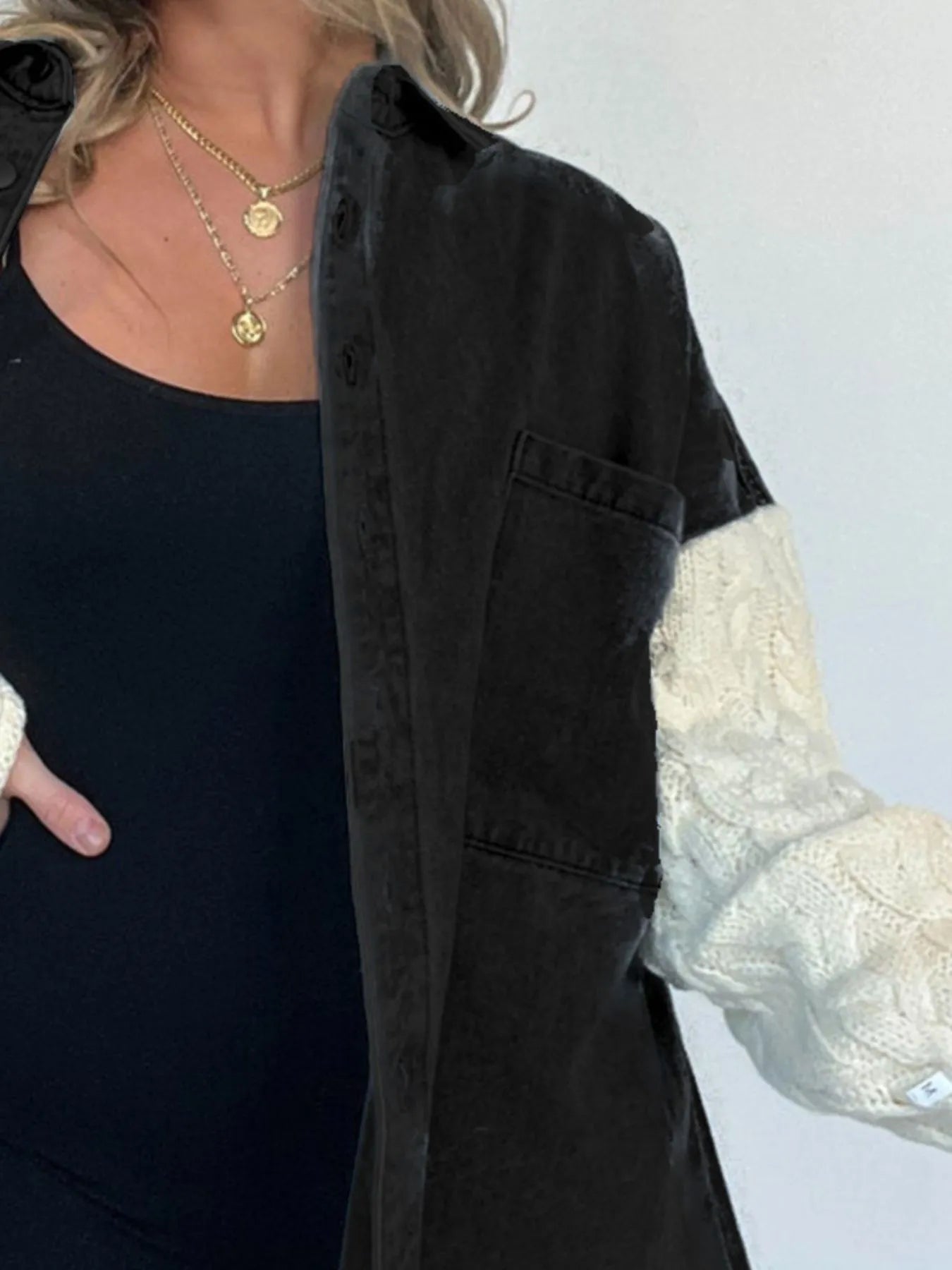 The Versaic™ Raw Hem Button-Up Patchwork Denim Jacket is more than just outerwear, it’s a statement piece that tells your story through every unique detail. Featuring cable-knit patchwork accents and a raw hem finish, this jacket blends rugged denim energy with soft, artistic expression.